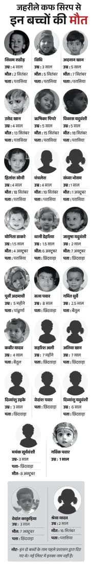 राजस्थान की सरकारी सप्लाई में भी इनपर रोक यही फार्मूले वाली सिरप राजस्थान की सरकारी सप्लाई में भी पाई गई थी, जहां इसे पीने से एक बच्चे की मौत हुई और कुछ डॉक्टर बीमार पड़े। इसके बाद एहतियात के तौर पर प्रदेश में भी इनकी सप्लाई रोकी गई है। अधिकारियों के अनुसार, चार सिरप के सैंपल जांच के लिए भेजे गए हैं। रिपोर्ट आने तक वितरण स्थगित रहेगा। तीन जांचें अब तक ठीक मिली हैं।