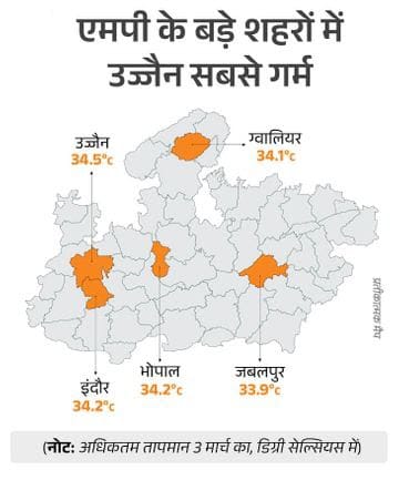 मार्च की शुरुआत में ही मध्य प्रदेश में गर्मी असर दिखाने लगी है। खासकर मालवा-निमाड़ यानी, इंदौर और उज्जैन संभाग के जिलों में दिन का टेम्पेरेचर बढ़ रहा है। मंगलवार को प्रदेश के 35 जिलों में अधिकतम तापमान 33 डिग्री के पार पहुंच गया। इनमें धार, नर्मदापुरम, खरगोन, खंडवा और रतलाम सबसे गर्म रहे।