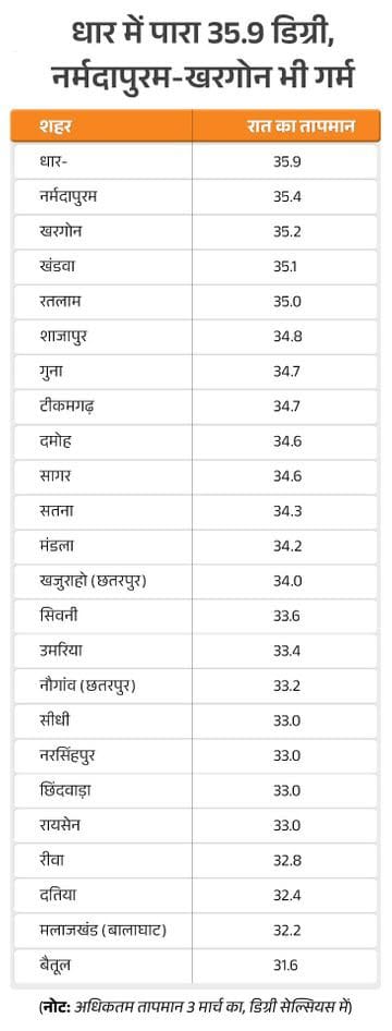 दिन के साथ रातें भी गर्म प्रदेश में दिन के साथ रातें भी गर्म हो गई हैं। सोमवार-मंगलवार की रात में जबलपुर, सागर, सिवनी, टीकमगढ़, नरसिंहपुर, गुना, धार, नर्मदापुरम, खंडवा, खरगोन, रतलाम और श्योपुर में न्यूनतम तापमान 16 डिग्री या इससे ज्यादा रहा। इनमें धार में सबसे ज्यादा 18.5 डिग्री, नर्मदापुरम में 18.4 डिग्री और खंडवा में 18 डिग्री दर्ज किया गया।