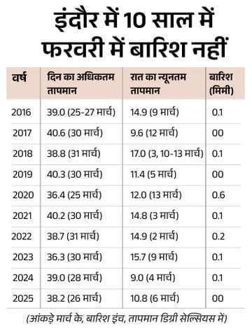 इंदौर में मार्च से गर्मी का असर तेज होने लगता है। यहां दिन का पारा 41.1 डिग्री तक पहुंच चुका है, जो 28 मार्च 1892 को दर्ज किया गया था। 4 मार्च 1898 को रात में पारा 5 डिग्री सेल्सियस तक रहा था।