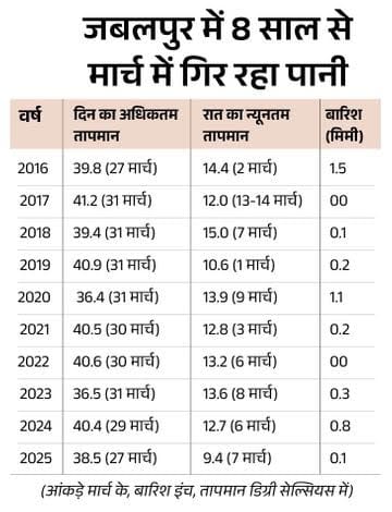 जबलपुर में मार्च में भी रातें ठंडी रहती हैं। पारा औसत 15 डिग्री के आसपास ही रहता है। वहीं, दिन में 36 से 40 डिग्री के बीच तापमान दर्ज किया जाता है। 31 मार्च 2017 को दिन का पारा 41.2 डिग्री सेल्सियस पहुंच चुका है, जबकि 4 मार्च 1898 में रात का तापमान 3.3 डिग्री दर्ज किया गया था। यहां मार्च में मावठा भी गिरता है। पिछले 10 में से 9 साल बारिश हो चुकी है।