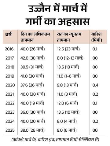 उज्जैन में दिन रहते हैं गर्म, 6 दिन बारिश का ट्रेंड भी उज्जैन में दिन गर्म रहते हैं। 22 मार्च 2010 को पारा रिकॉर्ड 42.5 डिग्री सेल्सियस पहुंच चुका है। वहीं, 1 मार्च 1971 की रात में न्यूनतम तापमान 4.6 डिग्री रहा था। पिछले साल दिन में तापमान 36 से 42 डिग्री सेल्सियस के बीच रहा है। उज्जैन में 2017 सबसे गर्म साल रहा था। मौसम विभाग के अनुसार, इस महीने बारिश भी होती है। एक दिन में पौने 2 इंच बारिश का रिकॉर्ड 17 मार्च 2013 का है।