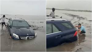 मीडिया रिपोर्ट्स के मुताबिक, ड्राइवर बीच पर स्टंट करने के इरादे से गाड़ी लेकर आया था, लेकिन जैसे ही बारिश शुरू हुई, समंदर किनारे की रेत दलदल में बदल गई और गाड़ी वहीं फंस गई. वायरल हो रहे वीडियो में देखा जा सकता है कि मर्सिडीज SUV आधी रेत में धंसी हुई है और दो लोग मिलकर उसके टायरों के नीचे से कीचड़ हटाकर रास्ता बनाने की कोशिश कर रहे हैं, ताकि गाड़ी किसी तरह बाहर निकल सके.