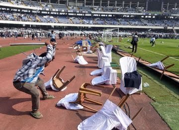 भगदड़ के दौरान दर्शकों ने स्टेडियम में कुर्सियां तोड़कर फेंकी।