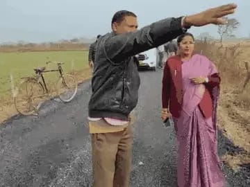 राज्यमंत्री प्रतिमा बागरी सड़क का निरीक्षण करने पहुंचीं थी। यहां पैर रखते ही सड़क उखड़ने लगी।