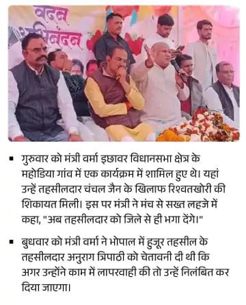 मध्यप्रदेश के राजस्व मंत्री करण सिंह वर्मा के एक विवादित बयान पर प्रदेशभर के तहसीलदारों और नायब तहसीलदारों ने मोर्चा खोल दिया है। मंत्री ने सीहोर में एक महिला नायब तहसीलदार को सार्वजनिक मंच पर अपमानित करते हुए जिले से भगा देने की धमकी दी थी।