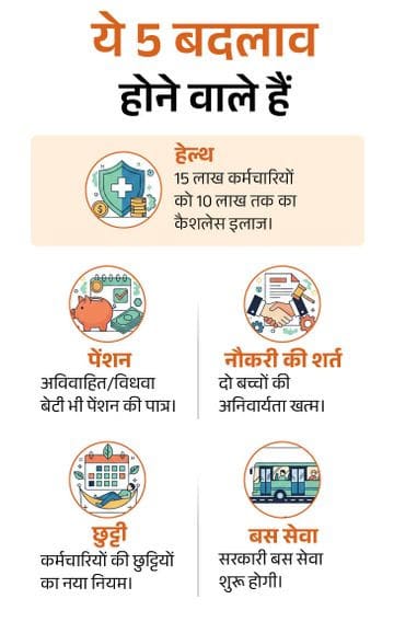 4. 48 साल बाद बदल रहे कर्मचारियों के छुट्टी नियम मध्य प्रदेश के 6.5 लाख से ज्यादा सरकारी कर्मचारियों के लिए 1 जनवरी 2026 से छुट्टियों का पूरा कैलेंडर बदलने जा रहा है। 48 साल पुराने मध्यप्रदेश अवकाश नियम 1977 की जगह अब मध्यप्रदेश सिविल सेवा (अवकाश) नियम 2025 लागू होंगे। नए नियम केंद्र सरकार की छुट्टियों के नियमों के लगभग समान हैं और इन्हें मौजूदा सामाजिक और प्रशासनिक जरूरतों के हिसाब से तैयार किया गया है।