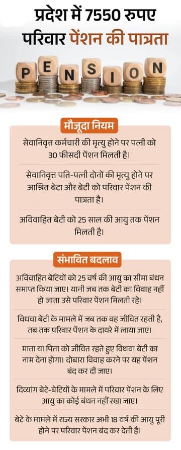 3.केंद्र के समान पेंशन नियम, बेटियों को मिलेगा फायदा मध्य प्रदेश सरकार पेंशन नियमों को केंद्र सरकार के नियमों के मुताबिक बना रही है। नए नियम के तहत, 25 साल से ज्यादा उम्र की अविवाहित, विधवा या परित्यक्ता बेटी भी परिवार पेंशन की पात्र होगी। वर्तमान में यह फायदा केवल 25 वर्ष तक की अविवाहित बेटी को ही मिलता है। यह प्रस्ताव केंद्र सरकार द्वारा 2011 में लागू की गई व्यवस्था पर आधारित है।