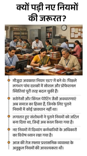 नए नियमों के मुताबिक अब बीमारी और मातृत्व अवकाश लेना ज्यादा सुविधाजनक होगा, वहीं इनके दुरुपयोग पर भी लगाम लगेगी। अधिकारी छुट्टी देने में मनमानी न कर सकें, इसके लिए रोस्टर बनाना अनिवार्य होगा। नए नियमों को ज्यादा जेंडर न्यूट्रल बनाया गया है, जिसमें सरोगेसी और सिंगल फादर जैसी नई परिस्थितियों के लिए भी प्रावधान जोड़े गए हैं।