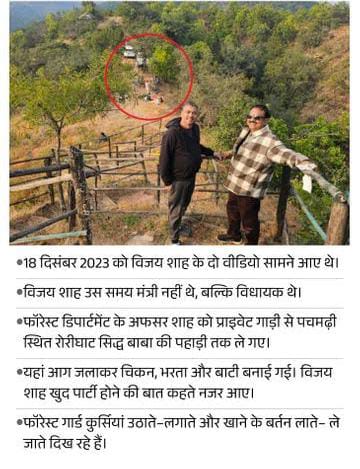 प्रारंभिक पूछताछ में बात सामने आई कि पूर्व मंत्री व विधायक विजयशाह धूपगढ़ के फुट हिल मार्ग से रोरीघाट सिद्धबाबा पहाड़ी पर पहुंचे थे। जांच का एक पॉइंट ये भी था कि 16 दिसंबर को विजय शाह की पार्टी का इंतजाम किस अधिकारी के निर्देश पर किया गया था? पूछताछ में ये तो पता चला कि सिद्धबाबा पहाड़ी एरिया में चौकीदारों ने खाना बनाया था।