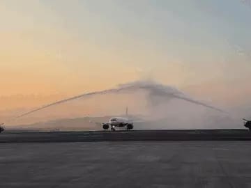 रनवे पर दो अग्निशमन वाहनों से फ्लाइट को वाटर कैनन सैल्यूट दिया गया।