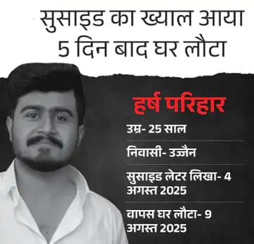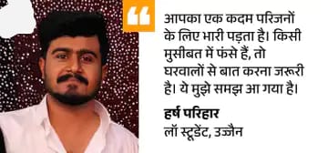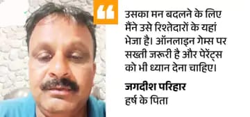 पिता बोले- अनहोनी की आशंका से डर गया था हर्ष के पिता जगदीश ने बताया कि जैसे ही मुझे हर्ष का सुसाइड नोट मिला मैं बेहद डर गया। मुझे लगा कि वाकई में वो कोई बड़ा कदम न उठा ले। लेटर में उसने न ढूंढने की बात लिखी थी। मैंने सोशल मीडिया के जरिए लोगों से मदद मांगी। क्या उन्हें पता था कि हर्ष परेशान है? ये पूछने पर जगदीश बोले- पिछले 15 दिनों से उसका बर्ताव अजीब था। वह गुमसुम रहने लगा था।