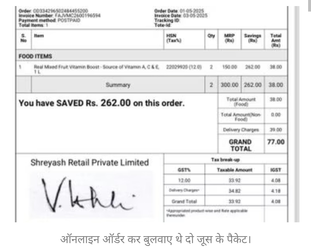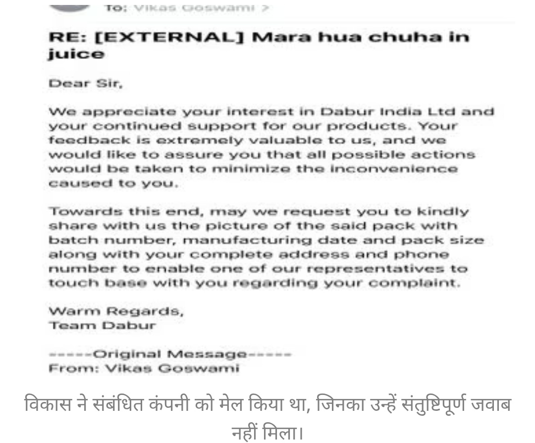 कंपनी को शिकायत, नहीं मिला संतोषजनक जवाब इस घटना के बाद परिवार के सदस्यों के होश उड़ गए। विकास ने इस पूरे वाकये का वीडियो भी बनाया और संबंधित कंपनी को मेल कर शिकायत दर्ज कराई। हालांकि कंपनी की ओर से जो जवाब मिला, वह उन्हें संतोषजनक नहीं लगा।