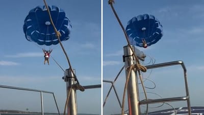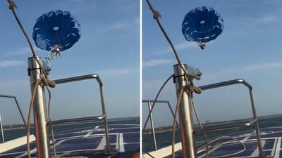 वायरल हो रहे इस वीडियो में साफ दिख रहा है कि नीले रंग के पैराशूट के सहारे टूरिस्ट आसमान की ऊंचाइयों पर मजे ले रहे हैं। नाव स्पीड में आगे बढ़ रही है। सब कुछ एकदम परफेक्ट लग रहा है। लेकिन तभी… अचानक ‘खचाक’ की आवाज होती है और नाव से जुड़ी पैराशूट की मोटी रस्सी बीच से ही टूट जाती है! यह वीडियो सोशल मीडिया के अलग-अलग प्लेटफॉर्म पर शेयर किया जा रहा है। X पर @Deadlykalesh ने पोस्ट किया। उन्होंने दावा किया कि यह घटना सोमवार 30 मार्च 2026 को हुई।