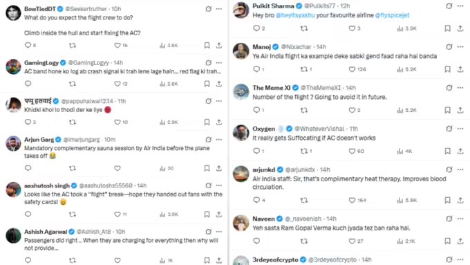 यूजर्स फ्लाइट में पैसेंजर्स को डरा देख उनके द्वारा उठाए कदम को सही बता रहे हैं। कमेंट सेक्शन में एक यूजर ने लिखा- एसी बंद होने को लोग अब रेड फ्लैग मानने लगे हैं। दूसरे यूजर ने कहा कि यात्रियों ने सही किया.. जब वे हर चीज के लिए चार्ज कर रहे हैं तो फिर वे सुविधाएं क्यों नहीं देंगे। तीसरे यूजर ने लिखा कि अगर AC काम न करे तो सचमुच घुटन होती है। चौथे यूजर ने कहा कि ये एक बंदा एयर इंडिया का उदाहरण देकर सबको डरा रहा है।