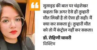 सफाईकर्मी मां की बेटी हूं, किसी का एक पैसा नहीं खाया रोहिणी घावरी इंदौर की रहने वाली हैं। वे कहती हैं, ‘मैं एक सफाई कर्मचारी की बेटी हूं। मेरी मां आज भी सफाईकर्मी का ही काम करती हैं। मैं बहुत मुश्किल से यहां तक पहुंची हूं और चंद्रशेखर ने मेरा सब कुछ बर्बाद कर दिया। मेरी इमेज और मेरा स्ट्रगल सबकुछ।’