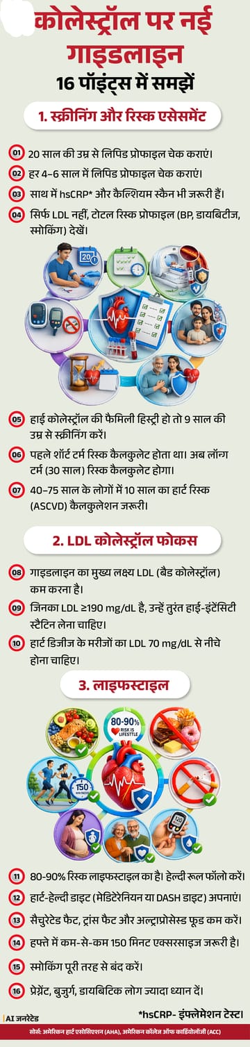 फिजिकल हेल्थ: 8 साल बाद आई AHA-ACC की नई कोलेस्ट्रॉल गाइडलाइन—हार्ट रिस्क के हिसाब से तय होगा LDL टारगेट, 100 mg/dL से नीचे रखें लेवल, 20 साल से शुरू करें टेस्ट