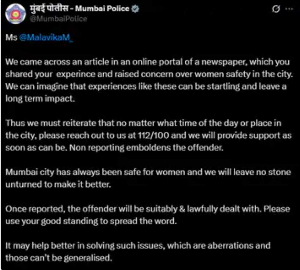 मालविका का बयान आने के बाद मुंबई पुलिस ने आधिकारिक सोशल मीडिया अकाउंट से इसका जवाब दिया है। पोस्ट में लिखा गया है, मिस मालविका, हमारे सामने वो ऑनलाइन पोर्टल आया है, जहां आपने अपना अनुभव शेयर कर, शहर में महिला सुरक्षा पर चिंता जाहिर की। हम सोच सकते हैं कि इस तरह के एक्सपीरियंस चौंकाने वाले होते हैं और लंबा असर छोड़ते हैं। इसलिए हमें ये दोहराना चाहिए कि दिन का कोई भी समय हो या शहर में कोई भी जगह हो, प्लीज 112/100 पर हमसे संपर्क करें और हम जल्द से जल्द सहायता देंगे। रिपोर्ट न करने से अपराधी का हौसला बढ़ता है।