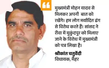 मुकुंदपुर को अपने क्षेत्र में बनाए रखने के लिए राजनीतिक दलों में आरोप-प्रत्यारोप का दौर शुरू हो गया है। सतना से पांच बार के सांसद रहे भाजपा के गणेश सिंह ने मुख्यमंत्री मोहन यादव को पत्र लिखकर गांवों को रीवा में शामिल करने के प्रस्ताव का विरोध किया। उन्होंने इसे रीवा को फायदा पहुंचाने की ‘साजिश’ बताया। वहीं, मैहर से पूर्व विधायक और विंध्य जनता पार्टी के संस्थापक नारायण त्रिपाठी ने उपमुख्यमंत्री राजेन्द्र शुक्ला पर मुकुंदपुर को हथियाने का आरोप लगाते हुए गंभीर आरोप लगाए।