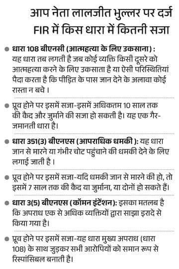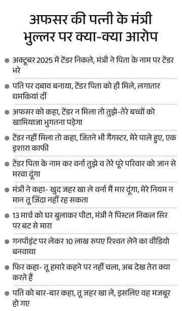 इससे पहले शनिवार आधी रात को पुलिस ने अमृतसर के रणजीत एवेन्यू थाने में पूर्व मंत्री भुल्लर, उनके पिता और PA दिलबाग पर सुसाइड के लिए उकसाने समेत कई धाराओं के तहत FIR दर्ज कर ली। इसमें दिए बयान में पत्नी ने कहा कि भुल्लर ने पति को धमकाया कि गैंगस्टर मेरे पाले हुए हैं। तेरे पूरे परिवार को खत्म करने के लिए एक इशारा ही काफी है। अगर तू मेरे नियमों को नहीं मान सकता तो तुझे जिंदा रहने का हक नहीं, तू जहर खा ले। इसके बाद पति ने शनिवार (21 मार्च) की सुबह सुसाइड किया था।