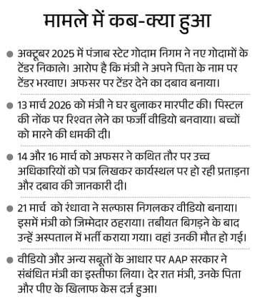 पंजाब में वेयरहाउस के डिस्ट्रिक्ट मैनेजर गगनदीप सिंह रंधावा के सुसाइड केस में उनका परिवार AAP सरकार के पूर्व मंत्री लालजीत भुल्लर और उनके पिता सुखदेव भुल्लर की गिरफ्तारी पर अड़ गया है। रंधावा की सरकारी टीचर पत्नी उपिंदर कौर ने अमृतसर में प्रेस कॉन्फ्रेंस कर कहा कि जब तक गिरफ्तारी नहीं होती, वह पोस्टमॉर्टम और अंतिम संस्कार नहीं करेंगे