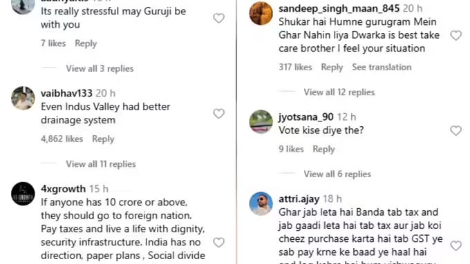 यूजर्स गुड़गांव की महिला की बातें सुनने के बाद कमेंट सेक्शन में जमकर रिएक्ट कर रहे हैं। एक यूजर ने लिखा- यह वास्तव में तनावपूर्ण है, गुरुजी आपका साथ दे। दूसरे यूजर ने कहा कि यहां तक कि सिंधु घाटी में भी बेहतर जल निकासी व्यवस्था थी। तीसरे यूजर ने लिखा कि शुक्र है हमने गुरूग्राम में घर नहीं लिया द्वारका सबसे अच्छा विकल्प है, ख्याल रखना भाई मुझे आपकी स्थिति का एहसास है।