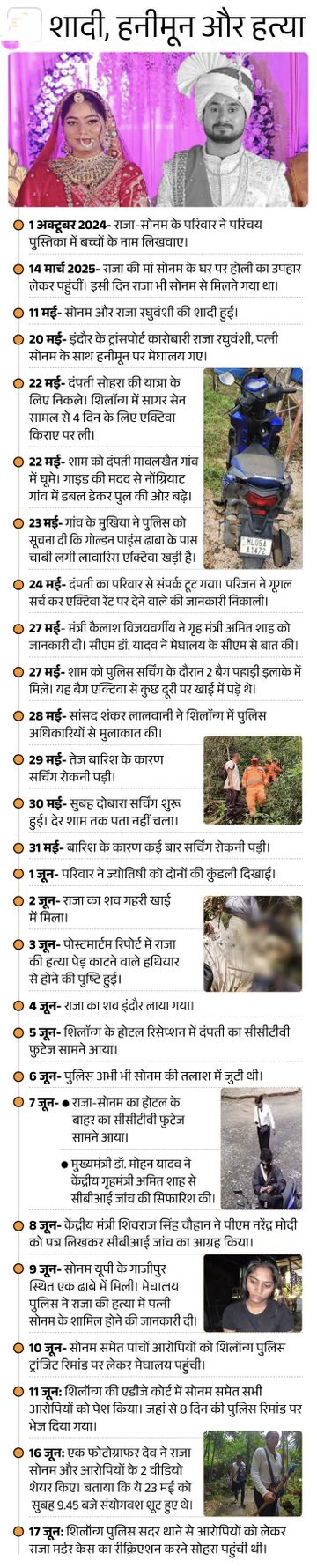 सोनम की सगाई राजा से फरवरी में हुई थी। शादी 11 मई को हुई थी। शादी के लगभग 15 दिन पहले ही राज और सोनम ने मिलकर ये तय कर लिया था कि राजा को रास्ते से हटाकर वे फिर शादी कर लेंगे।