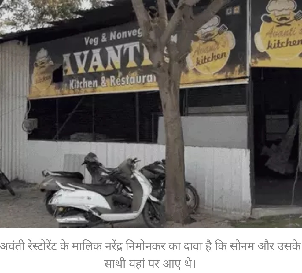 इंदौर के रेस्टोरेंट में रची गई हत्या की साजिश पुलिस का मानना है कि सोनम ने शादी से करीब एक महीने पहले ही राजा को मारने की प्लानिंग शुरू कर दी थी। ऐसा इसलिए माना जा रहा है क्योंकि आरोपी सोनम, राज और विशाल की अप्रैल में ही मुलाकात हो चुकी थी। पुलिस सूत्रों के मुताबिक, इंदौर के टीसीएस चौराहे के पीछे स्थित अवंती रेस्टोरेंट के मालिक नरेंद्र निमोनकर ने पूछताछ में यह जानकारी दी है।