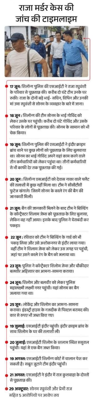 ये था पूरा मामला- 23 मई को हुई थी राजा की हत्या इंदौर निवासी ट्रांसपोर्ट कारोबारी राजा रघुवंशी की सोनम से शादी इसी साल 11 मई को हुई थी। इसके बाद अपनी पत्नी सोनम रघुवंशी के साथ इसी साल 21 मई को हनीमून मनाने के लिए मेघालय के शिलॉन्ग गए थे।