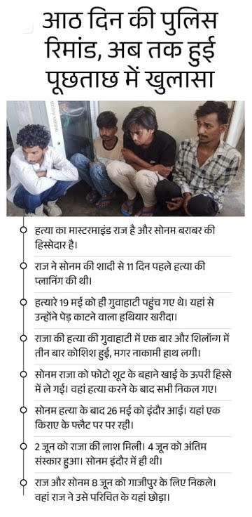 गोविंद की सूचना पर पुलिस ने उसे गिरफ्तार किया और मेघालय लेकर आई। सोनम इस समय मेघालय पुलिस की आठ दिन की रिमांड पर है। आज पूछताछ का चौथा दिन है।