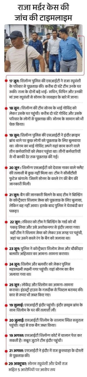 दूसरी बार बयान देने शिलाॅन्ग गए विपिन बता दें, राजा रघुवंशी हत्याकांड मामले में राजा के भाई विपिन दूसरी बार शिलॉन्ग में बयान देने गए हैं। सबसे पहले उनके बयान 11 नवंबर को हुए थे। कोर्ट ने उन्हें अगले दिन यानी दोबारा बयान के लिए बुलाया था, लेकिन उन्हें कोर्ट को बताया कि वे फ्लाइट की रिटर्न टिक बुक कर चुके हैं। उन्हें अगली तारीख दे दी जाए।