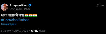 अनुपम खेर ने ऑफिशियल X प्लेटफॉर्म पर ऑपरेशन सिंदूर का पोस्टर शेयर कर लिखा, भारत माता की जय।