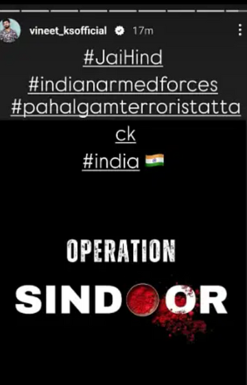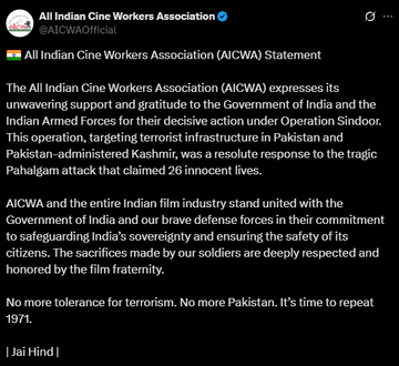 ऑल इंडिया सिने वर्कर्स एसोसिएशन की तरफ से भी ऑपरेशन सिंदूर पर भारत सरकार को समर्थन दिया गया है। एसोसिएशन की तरफ से की गई पोस्ट में लिखा गया है, भारत सरकार और भारतीय सशस्त्र बलों द्वारा की गई निर्णायक कार्रवाई के लिए उनके प्रति अपना अटूट समर्थन और आभार। पाकिस्तान और पाकिस्तान प्रशासित कश्मीर में आतंकवादी ढांचे को निशाना बनाकर किया गया यह ऑपरेशन, पहलगाम हमले का दृढ़ जवाब था जिसमें 26 निर्दोष लोगों की जान चली गई थी।