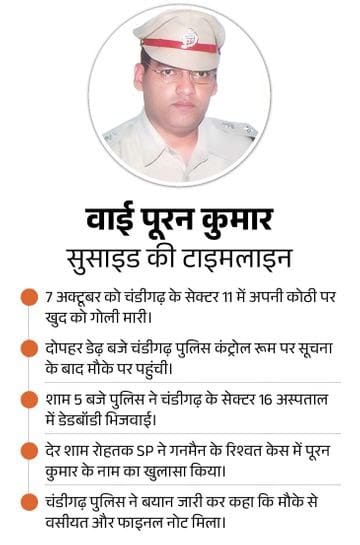 चंडीगढ़ पुलिस के मुताबिक अभी सुसाइड की वजह स्पष्ट नहीं है। पुलिस प्रवक्ता ने इतना जरूर कहा कि पूरन कुमार के शव के पास से पुलिस को वसीयत और फाइनल नोट (आखिरी लेटर) मिला है। हालांकि सुसाइड से पहले IG ने उसमें क्या लिखा, इसके बारे में पुलिस ने डिटेल्स शेयर नहीं की हैं।