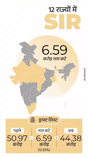 SIR से पहले इन राज्यों में 50.97 करोड़ मतदाता थे। वैरिफिकेशन के बाद 44.38 करोड़ रह गए। करीब 6.59 करोड़ मतदाताओं के नाम ड्राफ्ट वोटर लिस्ट से हट गए हैं। यह 12 राज्यों के कुल मतदाताओं का 12.93% है, यानी हर 100 वोटर्स पर करीब 13 नाम कट गए।