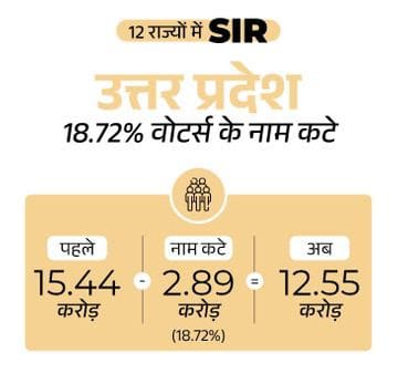 उत्तर प्रदेश में SIR की ड्राफ्ट लिस्ट में 2.89 करोड़ नाम कट गए हैं। ड्राफ्ट लिस्ट से पहले राज्य में 15.44 करोड़ थे, ड्राफ्ट लिस्ट में 12.55 करोड़ वोटर्स का नाम शामिल किया गया।
