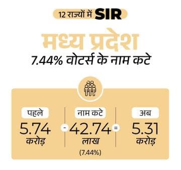 मध्य प्रदेश में SIR की ड्राफ्ट लिस्ट में 42.74 लाख नाम कट गए हैं। ड्राफ्ट लिस्ट से पहले राज्य में 5.74 करोड़ थे, ड्राफ्ट लिस्ट में 5.31 करोड़ वोटर्स का नाम शामिल किया गया।