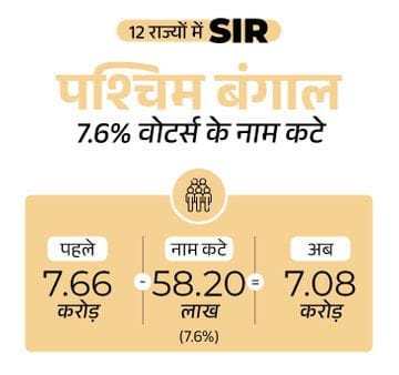 पश्चिम बंगाल में SIR की ड्राफ्ट लिस्ट में 58.20 लाख नाम कट गए हैं। ड्राफ्ट लिस्ट से पहले राज्य में 7.66 करोड़ थे, ड्राफ्ट लिस्ट में 7.08 करोड़ वोटर्स का नाम शामिल किया गया।