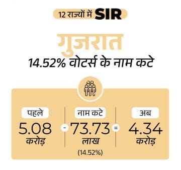 गुजरात में SIR की ड्राफ्ट लिस्ट में 73.73 लाख नाम कट गए हैं। ड्राफ्ट लिस्ट से पहले राज्य में 5.08 करोड़ थे, ड्राफ्ट लिस्ट में 4.34 करोड़ वोटर्स का नाम शामिल किया गया।