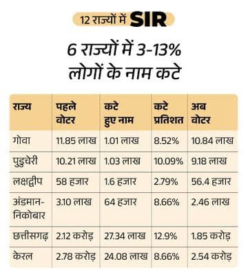 उधर, लक्षद्वीप में असर कम रहा। 58 हजार में से 1.6 हजार नाम कटे (2.79%), अब 56.4 हजार वोटर हैं। अंडमान-निकोबार में 3.10 लाख में से 64 हजार नाम हटे (8.66%), अब 2.46 लाख वोटर रह गए।