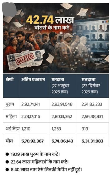 मध्य प्रदेश में 42.74 लाख नाम वोटर लिस्ट से हटा दिए गए हैं। इनमें 19.19 लाख पुरुष और 23.64 लाख महिलाएं हैं।
