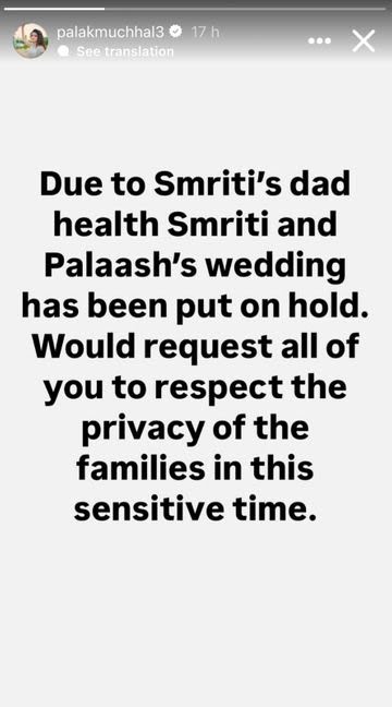 पलक की पोस्ट- हमारी प्राइवेसी का ध्यान रखें पारिवारिक सूत्रों से मिली जानकारी के अनुसार, पलाश मुछाल को हॉस्पिटल में एडमिट कराया गया है। हालांकि यह कंफर्म नहीं है कि उन्हें क्या हुआ है। इधर, पलक ने इंस्टाग्राम पर स्टोरी में लिखा है- स्मृति के पिता की तबीयत के कारण शादी टली है। आप सभी हमारी प्राइवेसी का ख्याल रखिए।