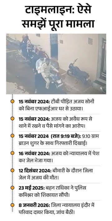 मामला 15 नवंबर 2024 का है। आरोप है कि जिस युवक को पुलिस ने घर से उठाया था वह टीबी का मरीज था। उसकी बहन राधिका सोनी पुत्री सुरेश सोनी, निवासी प्रकाशचंद्र सेठी नगर ने 23 मई 2025 को पुलिस कमिश्नर को शिकायत सौंपी थी।