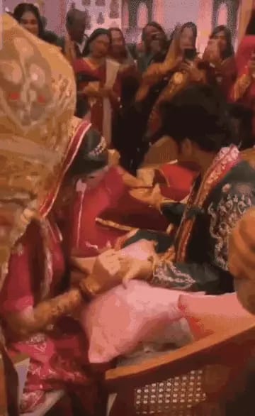 उन्होंने वहां मौजूद सभी पंडितों से आशीर्वाद लिया। इसके बाद दुल्हन शिप्रा शर्मा 12 बजे गोल्डन कलर की साड़ी में मंडप में पहुंची। इंद्रेश उपाध्याय ने हाथ में चांदी की छड़ी लिए हुए सभी रस्में निभाईं।