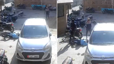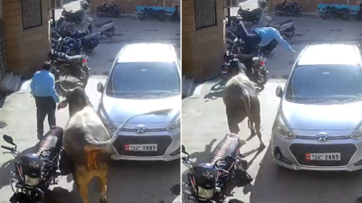 वायरल CCTV फुटेज किसी कंस्ट्रक्शन साइट की लगती है, जहां क्लिप की शुरुआत में एक कार के सामने 2 बाइक और उसके बीचो-बीच एक सांड खड़ा होता है। इतने में जैसे ही एक व्यक्ति बाई ओर से आता है, तो सांड उसे देखकर उसके पीछे-पीछे आ जाता है। फिर महज कुछ कदम जाकर सांड उस शख्स को पीछे से अपनी सींगों में फंसाकर उछाल देता है।