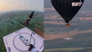 वीडियो में बॉयट्सोव एक स्क्वायर प्लेटफॉर्म पर नजर आते हैं, जो एक गर्म हवा के गुब्बारे से जुड़ा है. इस प्लेटफॉर्म के नीचे एक हॉरिजॉन्टल बार लगी है, जिस पर वह जिमनास्टिक के हैरतअंगेज मूव्स करते नजर आते हैं. न तो उनके पास सेफ्टी बेल्ट है, न पैराशूट और न ही कोई सुरक्षा जाल. X (पूर्व में ट्विटर) यूजर कॉलिन रग ने इस वीडियो को शेयर करते हुए लिखा, ‘रूसी बॉडीबिल्डर और डेयरडेविल सर्गेई बॉयट्सोव ने बिना पैराशूट के 1500 मीटर की ऊंचाई पर जिमनास्टिक कर वर्ल्ड रिकॉर्ड बनाने का दावा किया है. अगर कुछ भी गलत होता, तो कोई इंश्योरेंस नहीं था.’