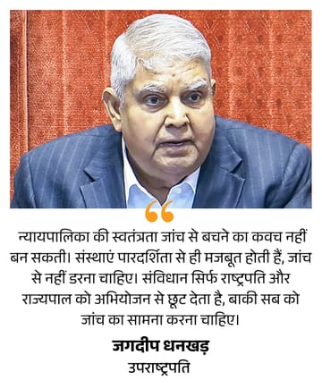 उपराष्ट्रपति जगदीप धनखड़ 17 अप्रैल को राज्यसभा इंटर्न के एक ग्रुप को संबोधित कर रहे थे। इस दौरान उन्होंने सुप्रीम कोर्ट की उस सलाह पर आपत्ति जताई, जिसमें राष्ट्रपति और राज्यपालों को बिलों को मंजूरी देने की समय सीमा तय की थी।