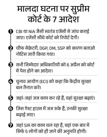सुप्रीम कोर्ट ने गुरुवार को पश्चिम बंगाल के मालदा जिले में SIR से जुड़े 7 इलेक्शन ऑब्जर्वर को बंधक बनाए जाने की घटना पर नाराजगी जताई। कोर्ट ने कहा- उन्हें नौ घंटे बंधक बनाकर रखा। खाना-पानी तक नहीं मिला। यह घटना सोची-समझी और भड़काऊ लगती है। हमें पता है उपद्रवी कौन हैं, इनका मकसद न्यायिक अधिकारियों का मनोबल गिराना और चुनावी प्रक्रिया को बाधित करना है।