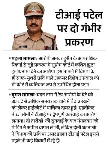 एक आरोपी पर चार केस की जगह आठ केस बनाने का गलत हलफनामा देने के मामले में 13 जनवरी को सुप्रीम कोर्ट में सुनवाई हुई। इस केस में आरोपी अनवर हुसैन की जमानत पहले ही मंजूर हो चुकी थी। इसी केस में असद वारसी ने इंटरविनर बनकर टीआई की कई करतूतों की पोल खोली। इसमें इंटरविनर वारसी की ओर से अधिवक्ता संजय हेगड़े ने बताया कि 25 नवंबर को पाकेट गवाह का मुद्दा आया था और सुप्रीम कोर्ट में सुनवाई चल रही थी, लेकिन इसके बाद भी इनके द्वार फिर 30 नवंबर को केस में पाकेट गवाह पेश किए गए। इस पर सुप्रीम कोर्ट ने गहरी नाराजगी जताई। सुप्रीम कोर्ट जस्टिस एहसानुद्दीन अमानउल्ला और जस्टिस आर. महादेवन ने इसे गंभीरता से लिया। कोर्ट ने शासकीय अधिवक्ता को निर्देश दिए कि वह शासन, सीपी को सूचित करें और संबंधित टीआई पटेल को लाइनअटैच किया जाए। भले ही सुप्रीम कोर्ट का आर्डर कभी भी अपलोड हो लेकिन आर्डर अपलोड होने का इंतजार नहीं करें, उन्हें लाइनअटैच किया जाए। साथ ही अगले आदेश तक उन्हें किसी भी थाने में कोई काम नहीं दिया जाए। इसका पालन सुनिश्चित कराया जाए।