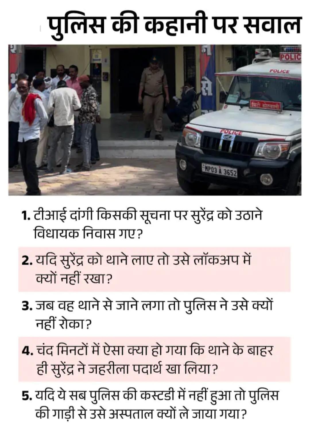 मामले की जांच एएसपी आदित्य पटले कर रहे हैं। उन्होंने बताया कि सुरेंद्र की मूवमेंट की हर कड़ी को जोड़ा जा रहा है। थाने और विधायक निवास के सीसीटीवी फुटेज के लिए डीवीआर जब्त किए गए हैं।